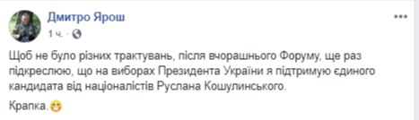 "Чтобы не было разных трактовок после вчерашнего Форума, еще раз подчеркиваю, что на выборах президента Украины я поддерживаю единого кандидата от националистов Руслана Кошулинского. Точка", - написал Ярош на своей странице в социальной сети Facebook в среду вечером.