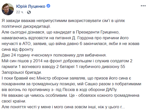 "Я всегда считал недопустимым использовать семьи в целях политической дискредитации. Но сегодня узнал, что кандидат в президенты Гриценко, пытаясь ответить на вопрос Д. Гордона о причинах его неучастия в АТО, заявил, что война давно бы закончилась, если бы я не скрывал сына от фронта. Даю 24 часа "честному" полковнику для прощения", - заявил Луценко в Facebook. Он также отметил, что его сын пошел на фронт в 2014 году добровольцем.