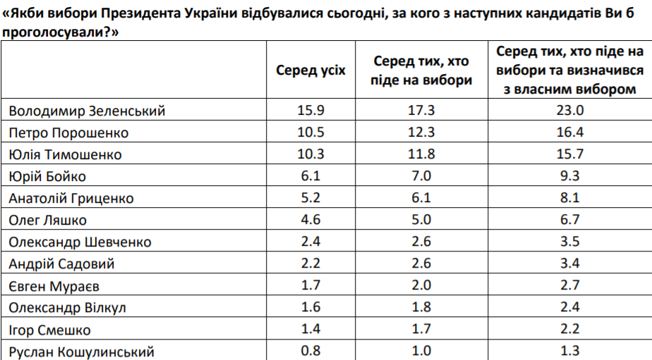 Еще одно исследование дает Зеленскому первое место. Это совместный опрос трех социологических служб – Социс, Центр Разумкова и КМИС, – который охватил 11 тысяч респондентов.