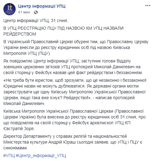 "Не надо быть юристом, чтобы понять, что это незаконно и беззаконно! Юридические названия не могут дублироваться. Как государственные органы могли зарегистрировать еще одну Киевскую Митрополию Украинской Православной Церкви, если таковая уже существует? Рейдерство!" - заявил заместитель председателя отдела внешних церковных связей Украинской православной церкви (МП) Николай Данилевич.