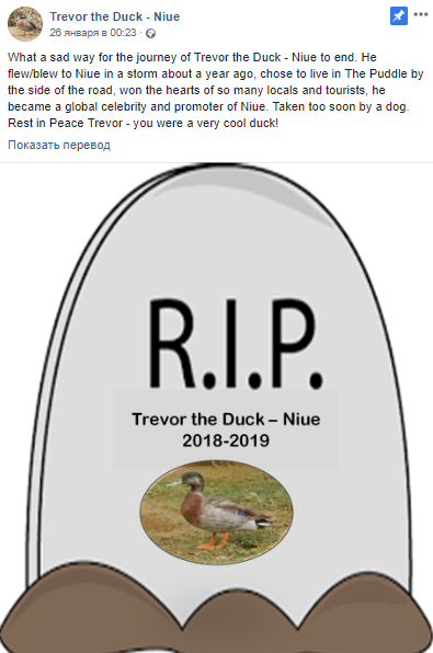 На днях на странице Тревора в соцсети появилось сообщение, что селезня загрызли собаки. Соболезнования в связи с утратой самой знаменитой и самой одинокой утки выразили представители Торговой палаты Ниуэ, а также Тревор Маллард - спикер новозеландского парламента, в честь которого и был назван селезень.