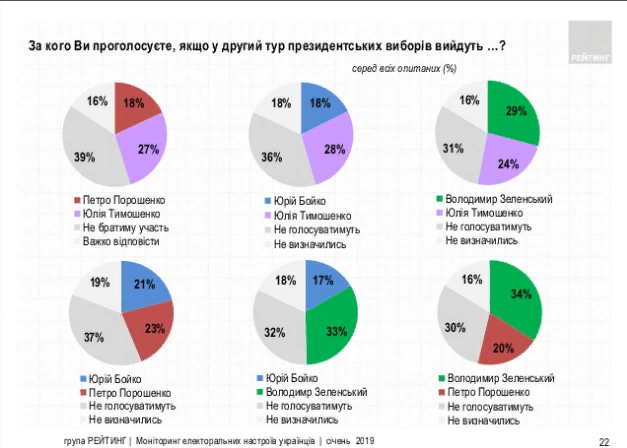 В случае выхода Зеленского во второй тур, он наберет 29% голосов против 24% у Тимошенко; 33% против 17% у Бойко; 34% против 20% у Порошенко.