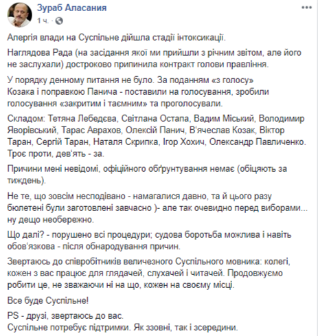 Украинский журналист Зураб Аласания комментируя причины своей отставки с поста председателя правления Национальной общественной телерадиокомпании Украины (НОТУ) сообщил, что причины ему не известны, а судебная борьба возможна и даже обязательна после обнародования причин произошедшего.