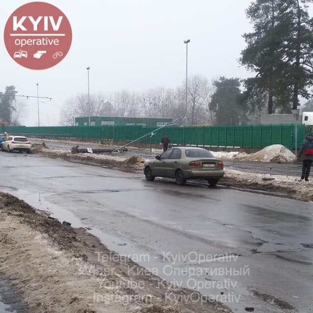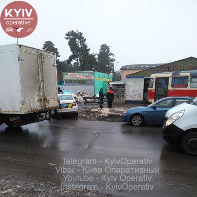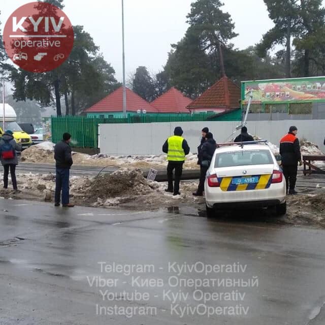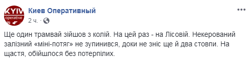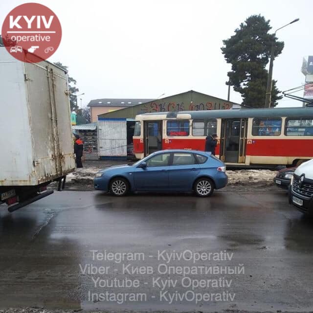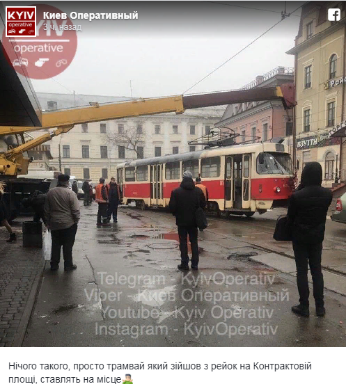 Сошел с рельс трамвай на Контрактовой площади. С помощью грузового крана его пытаются поставить на рельсы. Также сошел с путей трамвай на Лесной. Он сбил  два столба и только после этого остановился.