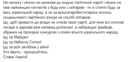 "Не принадлежу и никогда не принадлежал ни к одной политической партии и никогда не имел малейших контактов с кем-либо из олигархов - стоять буду за весь украинский народ, а не за узкопартийные интересы какого карманного партийного вождя на службе олигархов... Иду за Майдан!" - написал Тимошенко.