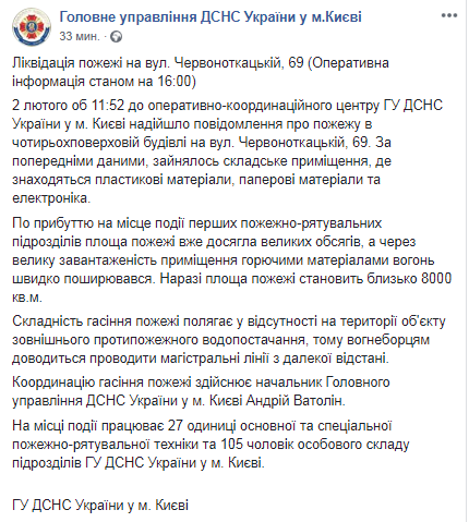Пожар, который 2 февраля возник около станции метро "Лесная" в Киеве, по состоянию на 15:00 субботы тушат более 100 спасателей. Об этом сообщает пресс-служба ГУ ГСЧС Украины в Киеве на странице в Facebook.