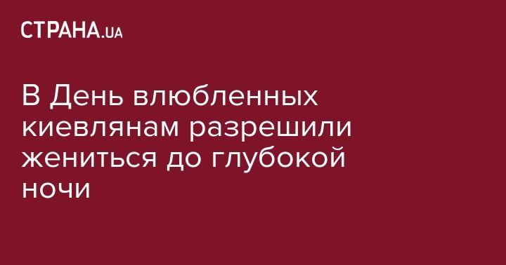14 февраля, в День святого Валентина, Центральный отдел государственной регистрации браков (проспект Победы, 11) и Соломенский отдел ЗАГС (бульвар Вацлава Гавела, 1/28) будут регистрировать браки в продленном режиме. Об этом сообщает пресс-служба Главного территориального управления юстиции в городе Киеве.