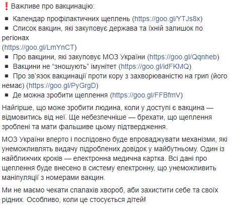 "Все данные о прививках будут внесены в электронную систему, которая сделает невозможным манипуляции с номерами вакцин", - сообщила Супрун. И.о. министра объяснила, что вакцинированный иммунитет останавливает развитие болезни или облегчает ее течение и предотвращает распространение инфекции, но прививки "на бумаге" этого сделать не могут. "Недопустимо, когда здоровье и жизнь детей сознательно ставят под угрозу их родители - покупают за взятку справки, ребенок вакцинирован. Такие действия опасны не только для детей, родители которых не вакцинируют, но и для всех окружающих", - написала Супрун. Она добавила, что об этом должны помнить "заботливые" родители, которые пытаются облегчить свою жизнь с помощью купленной справки о вакцинации.