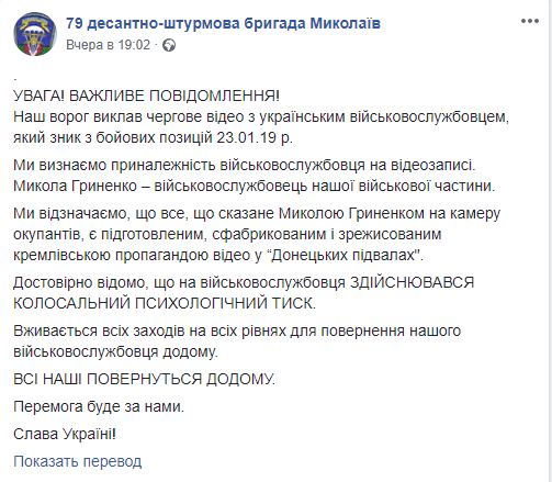 По их словам, боевики разместили видеозапись, на которой находился их исчезнувший сослуживец Николай Гриненко, о котором ничего не было известно с тех пор, как он пропал с боевой позиции 23 января этого года.