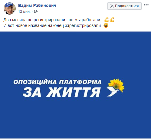 "Два месяца не регистрировали... но мы работали... и вот название наконец зарегистрировали", - написал народный депутат Вадим Рабинович на своей странице в Facebook.
