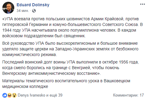 В Вашковецком медицинском колледже на Буковине студентам на занятиях рассказывают о том, как "УПА воевала против польских шовинистов". Об этом сообщил директор Украинского еврейского комитета Эдуард Долинский на своей странице в социальной сети Facebook.