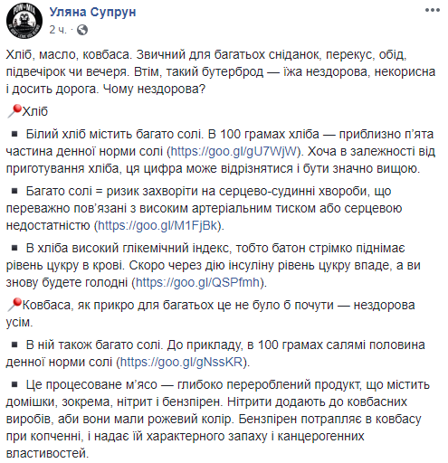 Глава Минздрава Ульяна Супрун, продолжает критиковать гастрономические предпочтения украинцев. Сегодня она проанализировала пользу привычного для рациона каждого человека перекуса - бутерброда с маслом и колбасой.