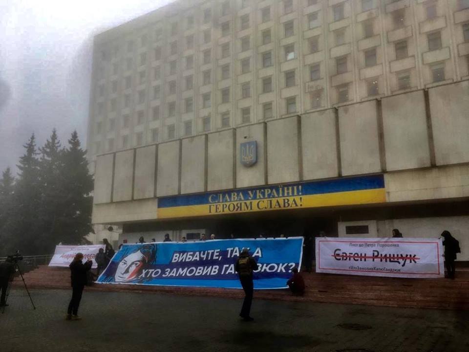 Отметим, что перед зданием ЦИК растянули огромный плакат с надписью: "Извините, так кто же заказал Гандзюк?".