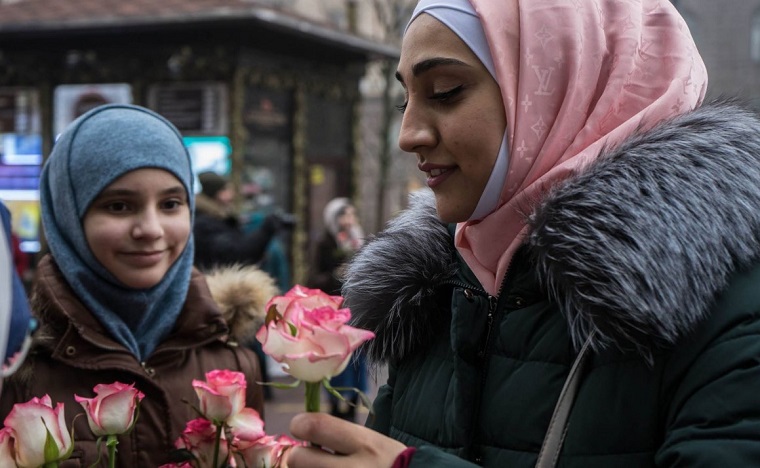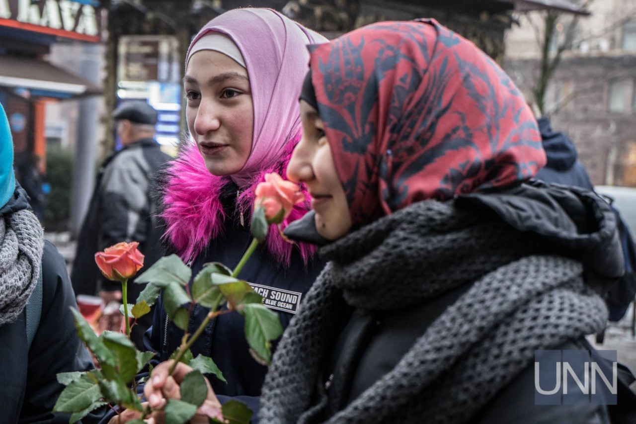 Возле станции метро "Крещатик" девушки и женщины в ярких хиджабах дарили украинкам розы и отвечали на вопросы прохожих.