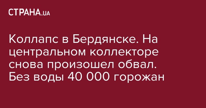 В связи с обвалом с 19:00 была прекращена централизованная подача воды в отдельных районах Бердянска: Колония, Макорты, Слободка, Коса и часть Центра (от пр. Азовского до пр. Восточного, от ул. Консульской до ул. Горького).