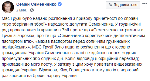 "В декабре-январе ряд пропагандистов кричали в СМИ о том, что "Семенченко задержали в Грузии с оружием", о том, что "Семенченко пользуясь дипломатическим паспортом убежал", "махал паспортом перед лицом грузинских полицейских". МВД Грузии были даны разъяснения, что в отношении гражданина Украины Семенченко вообще не осуществлялось никаких процессуальных или следственных действий", - написал он в соцсети.