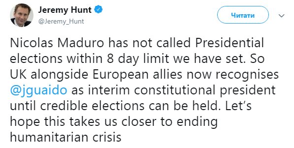Глава МИД Великобритании Джереми Хант в своем Twitter сообщил, что Мадуро не объявил о проведении президентских выборов в течение восьмидневного периода, как того требовали некоторые государства ЕС. А потому "Соединенное Королевство вместе со своими европейскими союзниками признает Хуана Гуайдо временным президентом до момента проведения заслуживающих доверия выборов".
