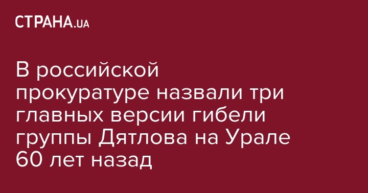 Сотрудники российской прокуратуры рассматривают три основные версии гибели туристов группы Дятлова в 1959 году на Северном Урале. Об этом сообщает "Интерфакс", ссылаясь на  главу управления по надзору за исполнением федерального законодательства прокуратуры Свердловской области Андрея Курьякова.
