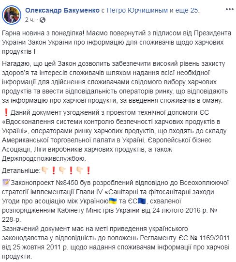 "Этот закон позволит обеспечить высокий уровень защиты здоровья и интересов потребителей путем предоставления всей необходимой информации для осуществления потребителями сознательного выбора пищевых продуктов и ввести ответственность операторов рынка, отвечающих за информацию о пищевых продуктах, за введение потребителей в заблуждение", - написал замглавы аграрного комитета народный депутат Александр Бакуменко (фракция БПП) на своей странице в Facebook.