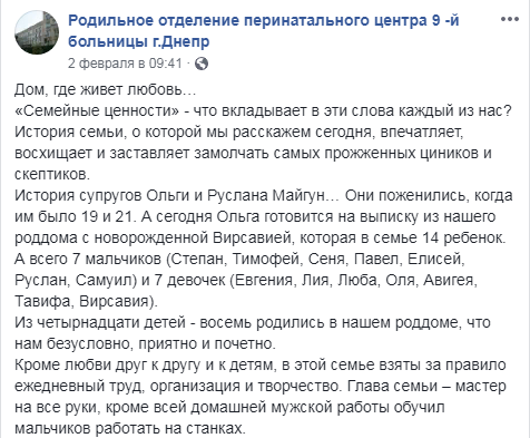 Об этом сообщается на Facebook-странице Родильного отделения перинатального центра 9-й больницы города Днепр. В семье есть еще 13 детей. Супруги Руслан и Ольга Майгун поженились, когда им было 19 и 21.