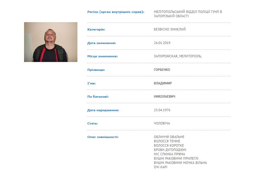 Согласно ей, мужчина исчез с поля зрения правоохранителей 26 января 2019 года. Место исчезновения – Мелитополь Запорожской области. Разыскивает Горбенко Мелитопольское отделение полиции ГУ Нацполиции в Запорожской области.