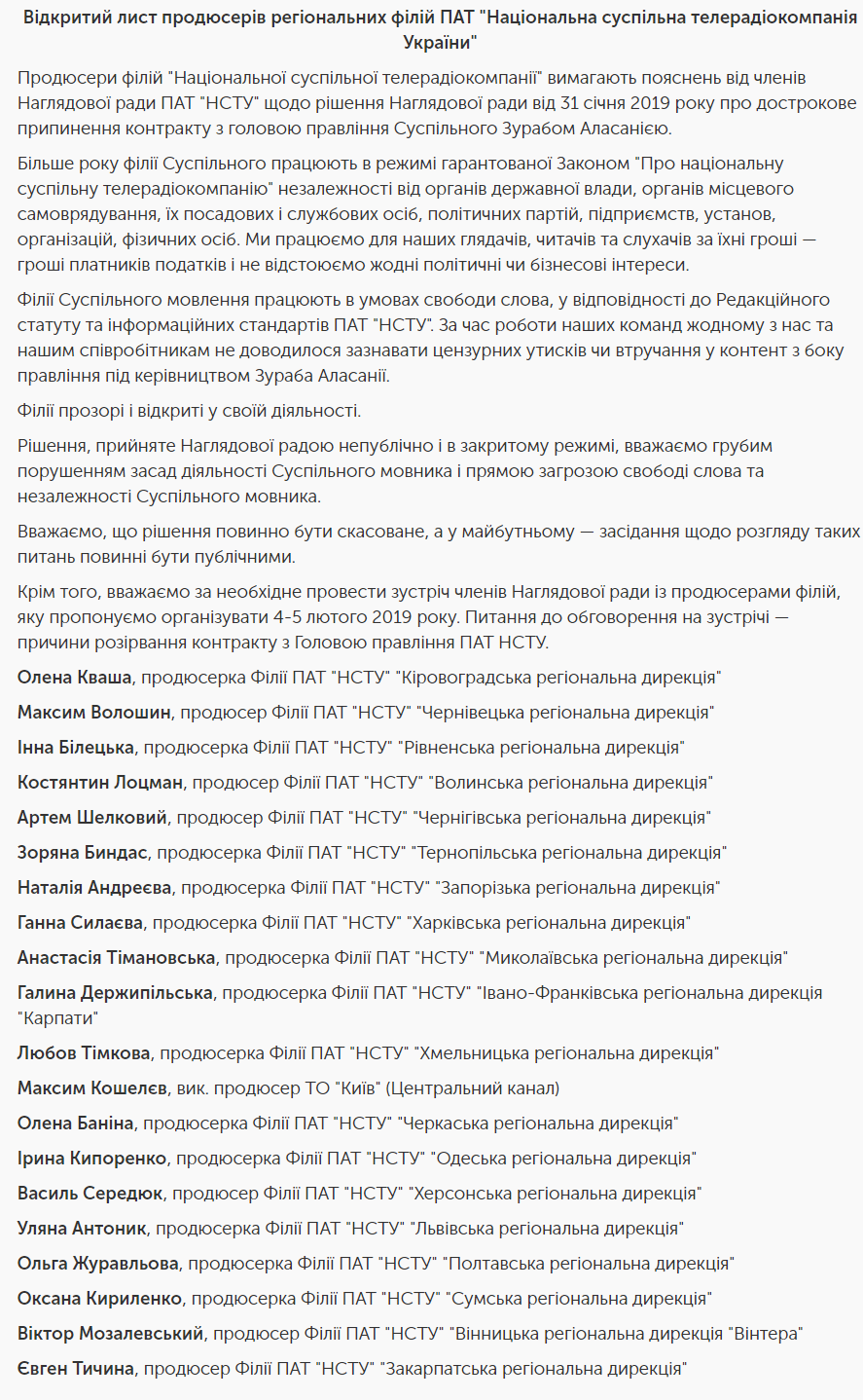 Продюсеры филиалов "Национальной общественной телерадиокомпании" требуют объяснений от членов Наблюдательного совета ПАО "НСТУ" по решению Наблюдательного совета от 31 января 2019 года о досрочном прекращении контракта с главой правления Общественной Зурабом Аласанией.