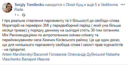 "И о реальном отношении парламента и его большинства к свободе слова. Мораторий на проверки СМИ в предвыборный период (который длится уже больше месяца) в повестке дня сегодня стоит 30-м вопросом. Между Рекомендациями по антропогенным изменениям климата и переименованием села Химчин Косовского района. Это еще одно доказательство, что для нынешнего парламента свобода слова и защита прав журналистов - не приоритет", - написал Томиленко.