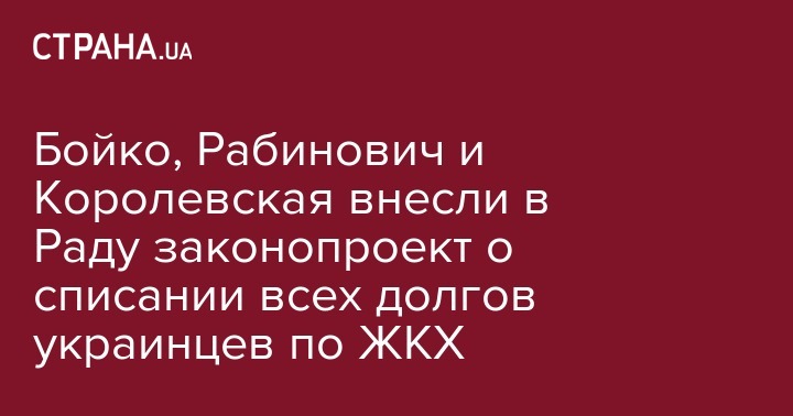 Народные депутаты от "Оппозиционной платформы - За життя" Юрий Бойко, Вадим Рабинович и Наталия Королевская внесли в парламент законопроект №9527 "О списании задолженности населения за поставку природного газа, централизованное отопление и поставку горячей воды, поставку электрической энергии, сформировавшейся по состоянию на 1 января 2019 года".