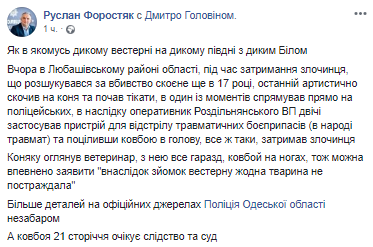 В Одесской области разыгрался настоящий вестерн. Полиция со стрельбой задерживала мужчину, подозреваемого в совершении убийства еще в 2017-м году. При этом злоумышленник пытался скрыться от правоохранителей, оседлав коня. Об этом на своей странице в Facebook сообщил помощник начальника облуправления Нацполиции в Одесской области Руслан Форостяк.