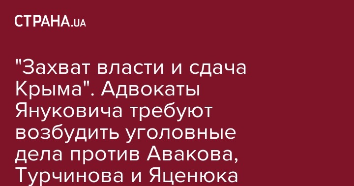 Адвокаты бывшего президента Виктора Януковича обратились с просьбой к Государственному бюро расследований открыть уголовное производство против секретаря СНБО Александра Турчинова, главы МВД Арсена Авакова, экс-премьера Арсения Яценюка, спикера Рады Андрея Парубия и других представителей действующей власти по подозрению в незаконном захвате власти и сдаче Крыма.