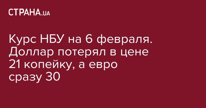 Курс НБУ на 6 февраля. Доллар потерял в цене 21 копейку, а евро сразу 30