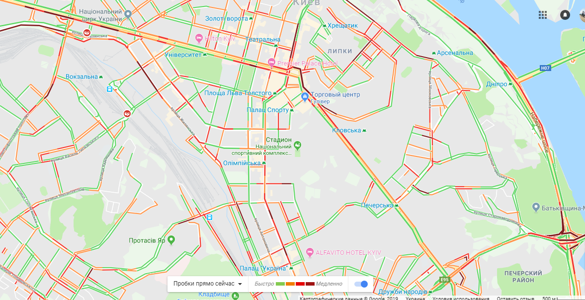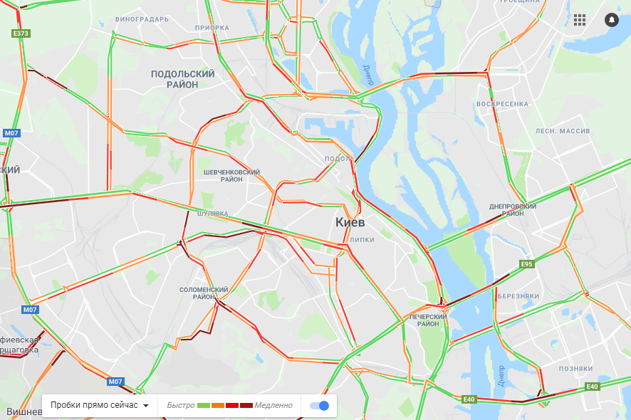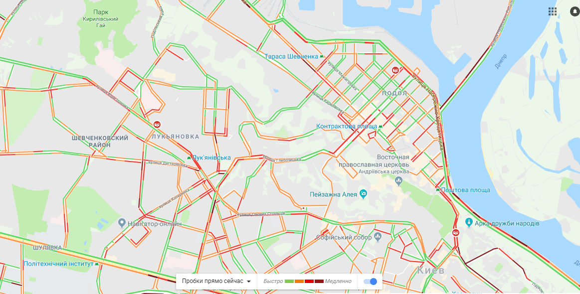 Как и обычно, самые мощные пробки наблюдаются в центре города. Автомобили в районе станций метро "Житомирская" и "Берестейская" стоят в тянучках. Сковано движение по бульвару Тараса Шевченко в обоих направлениях.