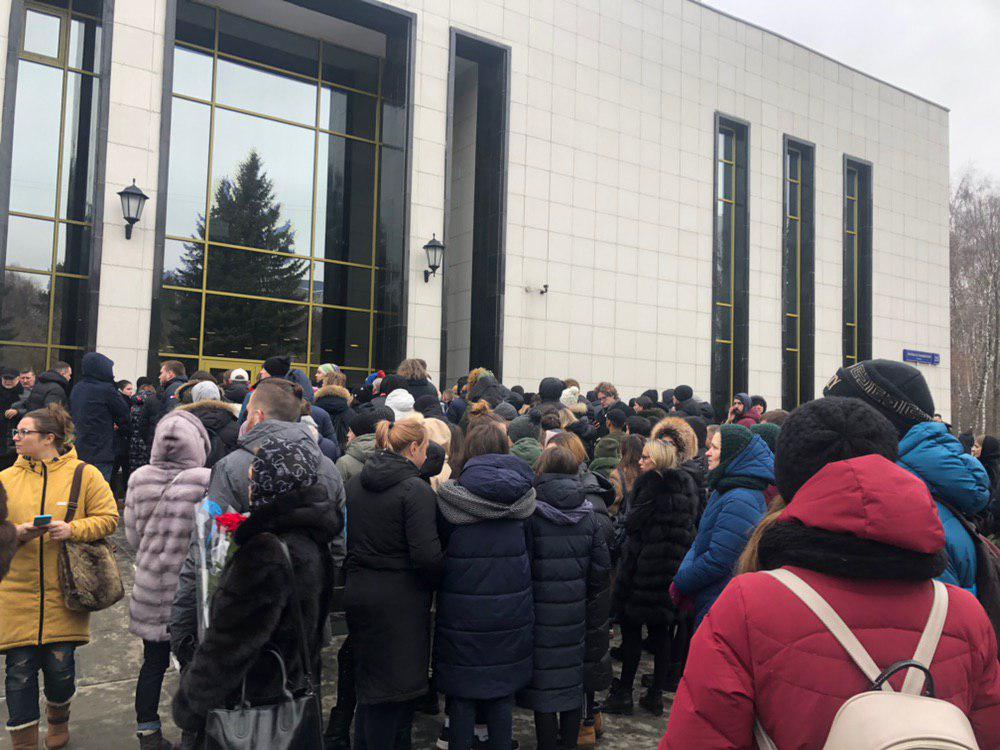 Церемония прощания задерживаемся на полчаса. У входа в здание собрались около двухсот человек.