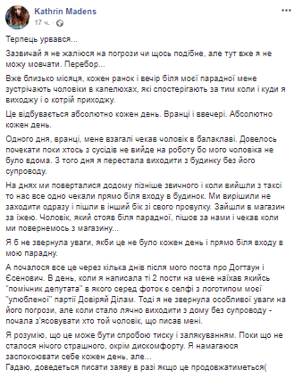 "Следует напомнить о том, что Катя Гандзюк начала замечать, что за ней следят как минимум за полгода до нападения. Призываем вас распространить этот пост. Мы должны сделать этих людей известными, чтобы и заказчики, и исполнители тысячу раз подумали, прежде чем сделать непоправимое", - отмечают активисты и публикуют фото Екатерины Маденс.