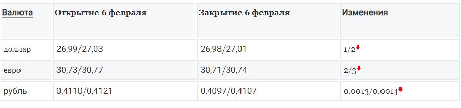 По данным НБУ, справочный курс гривни к доллару США на межбанковском валютном рынке 6 февраля укрепился до 26.9622 грн/$1 с 27,2199 грн/$1.