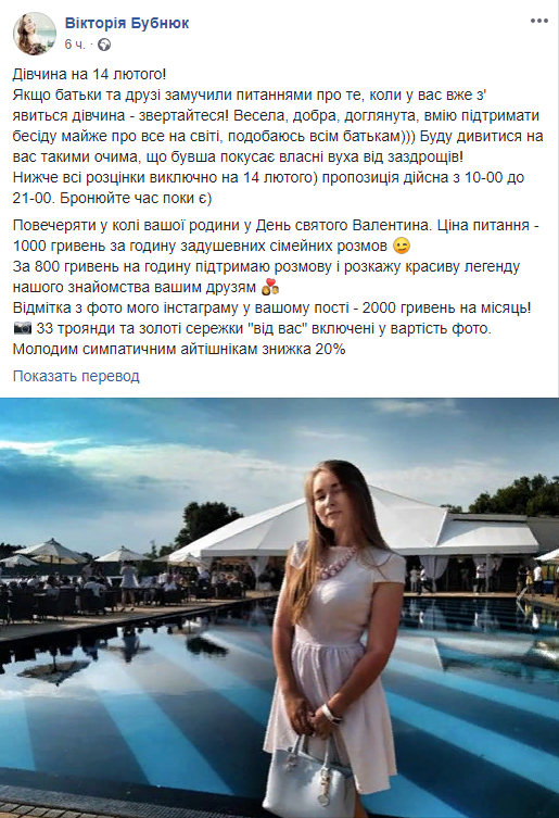 Также в посте Бубнюк можно увидеть и расценки на ее услуги 14 февраля. Так, час совместного ужина в кругу семьи клиента с "задушевными семейными разговорами" обойдется в 1000 гривен, а беседа и "красивая легенда о знакомстве" для друзей клиента будет стоить уже 800 гривен за час. Также девушка предлагает сделать отметку своей фотографии в посте мужчины на месяц за 2000 гривен. Как уточняет Бубнюк, в стоимость данной услуги входит "33 розы и золотые сережки" для фотографии. Для "молодых и симпатичных айтишников" она предлагает 20% скидку.