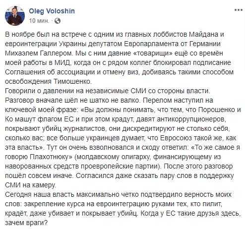 "В ноябре был на встрече с одним из главных лоббистов Майдана и евроинтеграции Украины депутатом Европарламента от Германии Михаэлем Галлером. Мы с ним давние "товарищи" еще со времен моей работы в МИД, когда он с рядом коллег блокировал подписание Соглашения об ассоциации и отмену виз, добиваясь такими способом освобождения Тимошенко.