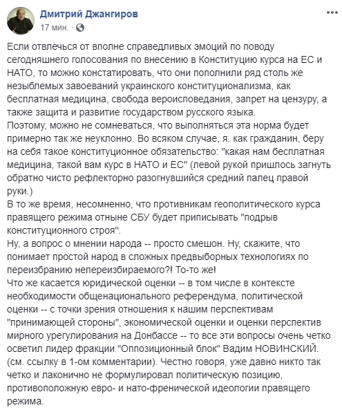 Журналист Дмитрий Джангиров: "Если отвлечься от вполне справедливых эмоций по поводу сегодняшнего голосования по внесению в Конституцию курса на ЕС и НАТО, то можно констатировать, что они пополнили ряд столь же незыблемых завоеваний украинского конституционализма, как бесплатная медицина, свобода вероисповедания, запрет на цензуру, а также защита и развитие государством русского языка.