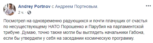 Политик Андрей Портнов: "Посмотрел на одновременно радующихся и почти плачущих от счастья по несуществующему НАТО Порошенко и Парубия на парламентской трибуне. Думаю, точно также могли бы выглядеть начальники Габона, если бы утвердили у себя на заседании космическую программу".