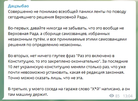 Во-первых, давайте никогда не забывать, что это вообще не Верховная Рада, а сборище самозванцев, избранных незаконным путем, и все принимаемые этими самозванцами решения по определению незаконны.