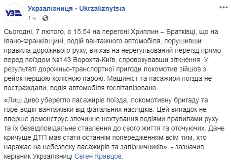 "Водитель грузового автомобиля, нарушив правила дорожного движения, выехал на нерегулируемый переезд прямо перед поездом №143 Ворохта - Киев, спровоцировав столкновение. В результате дорожно-транспортного происшествия локомотив сошел с рельсов первой колесной парой. Машинист и пассажиры поезда не пострадали, водитель автомобиля госпитализирован", - говорится в опубликованном сообщении.