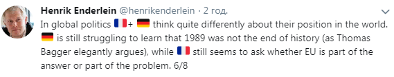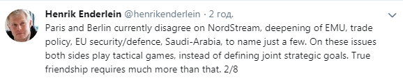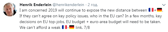 Он добавил, что Макрон сейчас сфокусирован на внутренней политике, что "понятно", учитывая обстановку во Франции, однако есть и все больше признаков "затяжного отчуждения" между Германией и Францией. "Это вызывает у меня тревогу", - сказал Ендерляйн.