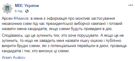 Надеюсь, что это остановит тех, кто хочет нарушать закон. А если это не остановит, то ничто не помешает мне назвать кошку кошкой и публично разоблачить грязные схемы, фамилии кандидатов и тех, кто выполняет эти схемы", - заявил Аваков в эфире ток-шоу "Право на власть".