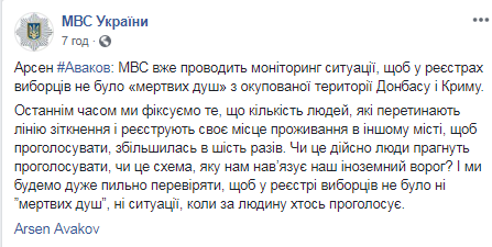 Глава Министерства внутренних дел Арсен Аваков, заявил о том, что его ведомство уже проводит мониторинг ситуации, чтобы в реестрах избирателей не оказалось "мертвых душ" с неподконтрольной территории Донбасса и аннексированного Крыма.