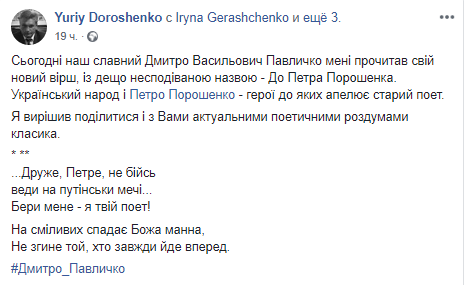 "Сегодня наш славный Павлычко мне прочитал свое новое стихотворение, с несколько неожиданным названием - До Петра Порошенко. Украинский народ и Петр Порошенко - герои к которым апеллирует старый поэт", - написал Дорошенко.