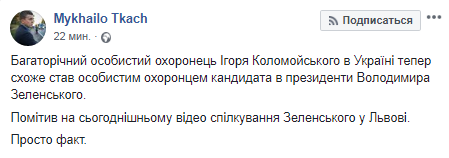 "Многолетний личный охранник Игоря Коломойского в Украине теперь похоже стал телохранителем кандидата в президенты Владимира Зеленского. Заметил на сегодняшнем видео общения Зеленского во Львове", - отметил он.