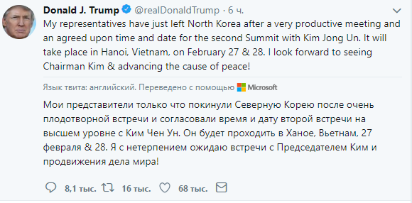 "Мои представители только что покинули Северную Корею после очень продуктивной встречи и согласования времени и даты проведения второго саммита с (лидером КНДР) Ким Чен Ыном. Он состоится в Ханое, Вьетнам, 27 и 28 февраля", - написал Трамп.