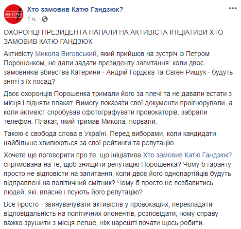 "Активисту Николаю Выговскому, который пришел на встречу с Петром Порошенко, не дали задать президенту вопрос: когда двое заказчиков убийства Екатерины - Андрей Гордеев и Евгений Рищук - будут сняты с должностей?", - сказано в сообщении.