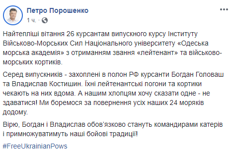 "Самые теплые поздравления 26 курсантам выпускного курса Института Военно-Морских сил Национального университета "Одесская морская академия" с получением звания "лейтенант" и военно-морских кортиков. Среди выпускников - захваченные в плен РФ курсанты Богдан Головаш и Владислав Костышин. Их лейтенантские погоны и кортики ждут их дома. А нашим ребятам хочу сказать одно - не сдаваться! Мы боремся за возвращение всех наших 24 моряков домой", - отметил Порошенко.