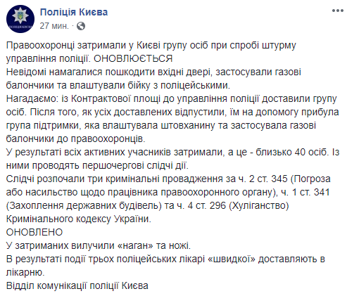 По утверждению националистов, они вели себя мирно. "На Контрактовой менты задержали и увезли в РУВД десяток активистов С14. Причин законных - никаких", - написал в Facebook глава ультраправой группировки Евгений Карась.